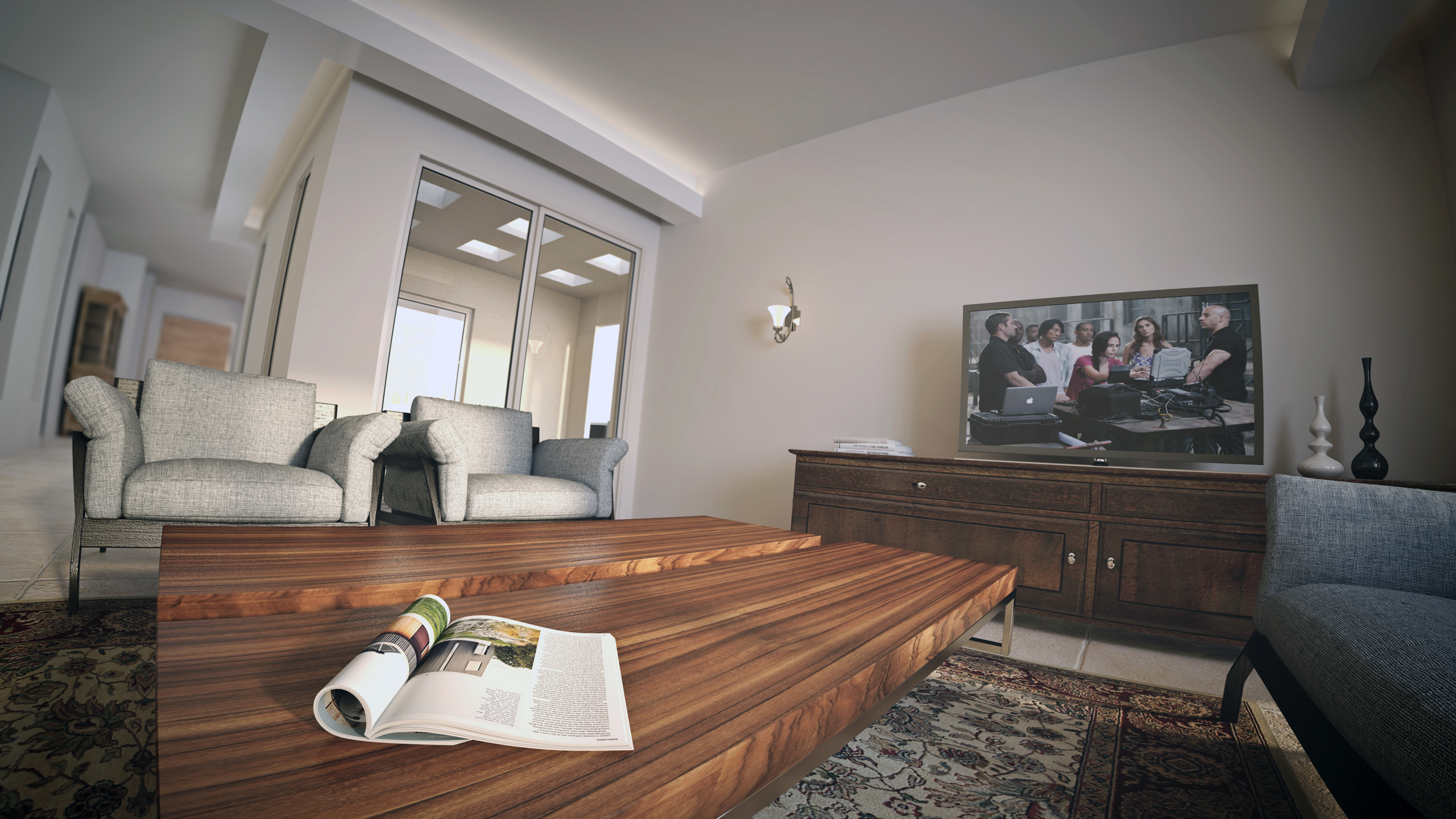 4) The light is very evenly distributed in the sense that every part of the room (especially the big first living room) gets the same amount and the same color of light. In reality some areas would get less light than others, and some parts would get a more yellow sunlight shade, other a more blueish atmosphere shade, or even greenish or brown if there is grass or dirt outside. These tints are very subtle so don't overdo them.