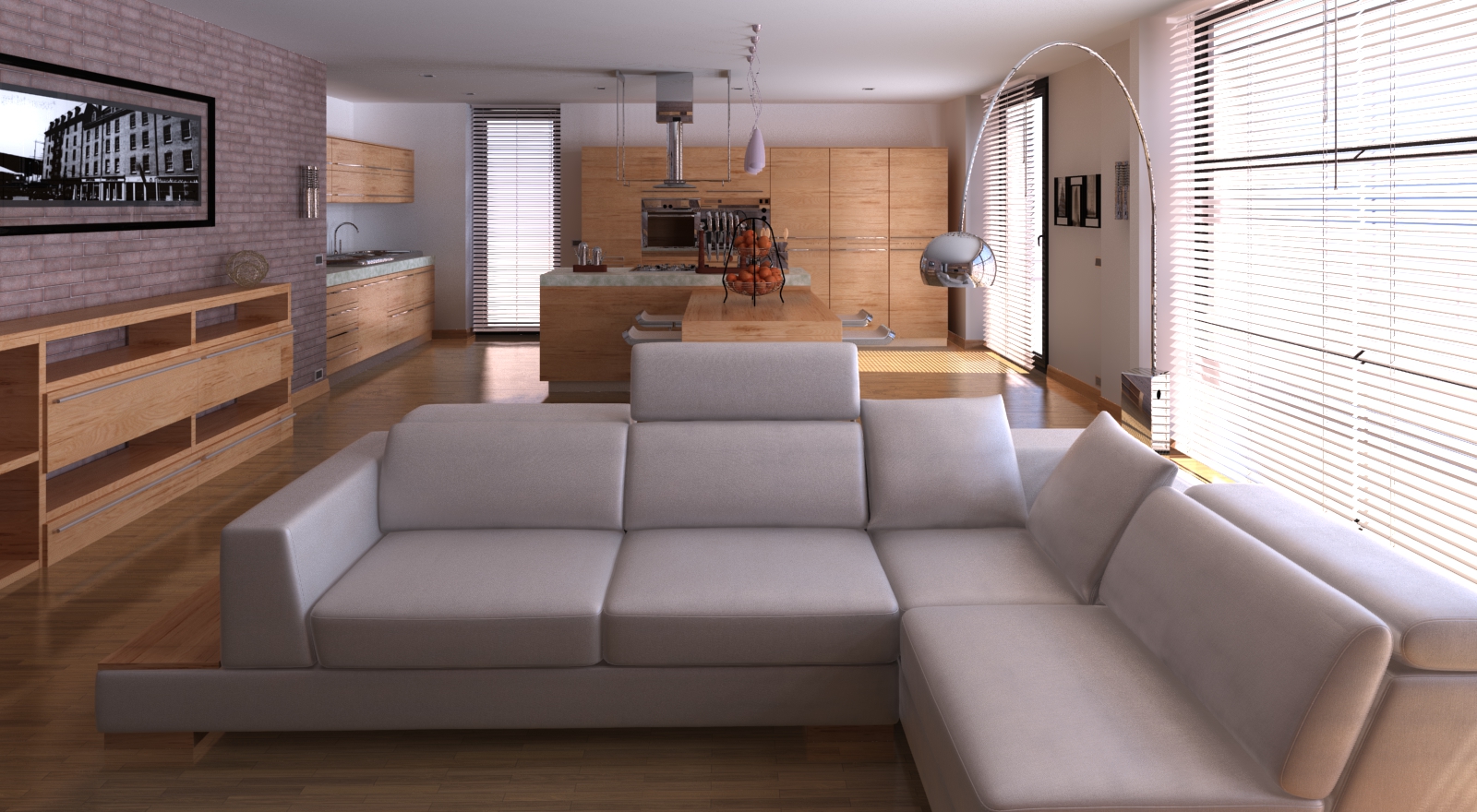 Also imho scene need a bit more life, more light everywhere, nice Sun effect coming through three leafs, less pink color, more details on sofa - there is empty almost half of scene! make this part boring and "flat" feeling. Sun effect should go on the furnitures to "vivid" contrast..not only floor, which indeed is boring by itself. Light in kitchen island area. Floor has bad surfacing. That`s all in the first shoot. I hope I helped a bit :wink:
