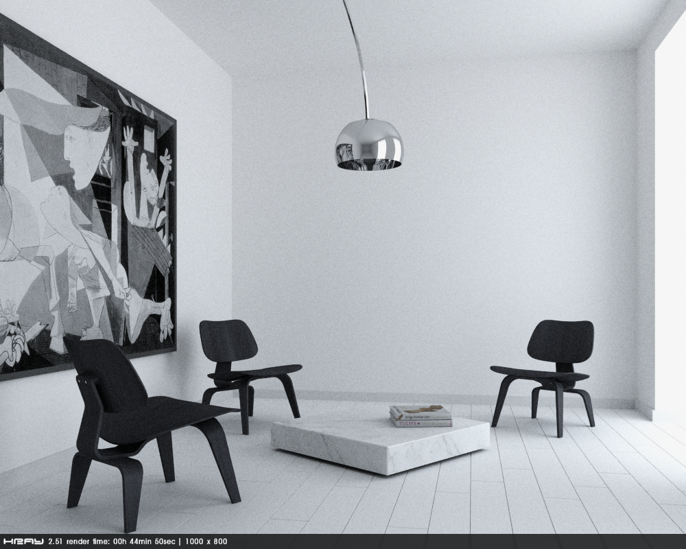 Setup is very basic and actually is nothing to do in Kray (I render with two passes which is necessary). Btw QMC I do not like it I do not use and I will never use it...is too slow, too noise, ruin surfaces setup, make longer AA phase. I am fan of pure Final Gathering which is difficult but only Kray offer clean GI (V-ray is far away from this quality) and only problem with Kray is with small objects in scene (we need GI per pixel for that or Z axis fallow GI) Why V-ray in this case win. Somebody also complain AA in Kray but true is in middle, because Kray has some problems with GI generally, why AA, blur, transparency phases render slow also (huge part of power CPU is wasted for Final Gather)...why Kray need new engine which automatically make faster render those phases