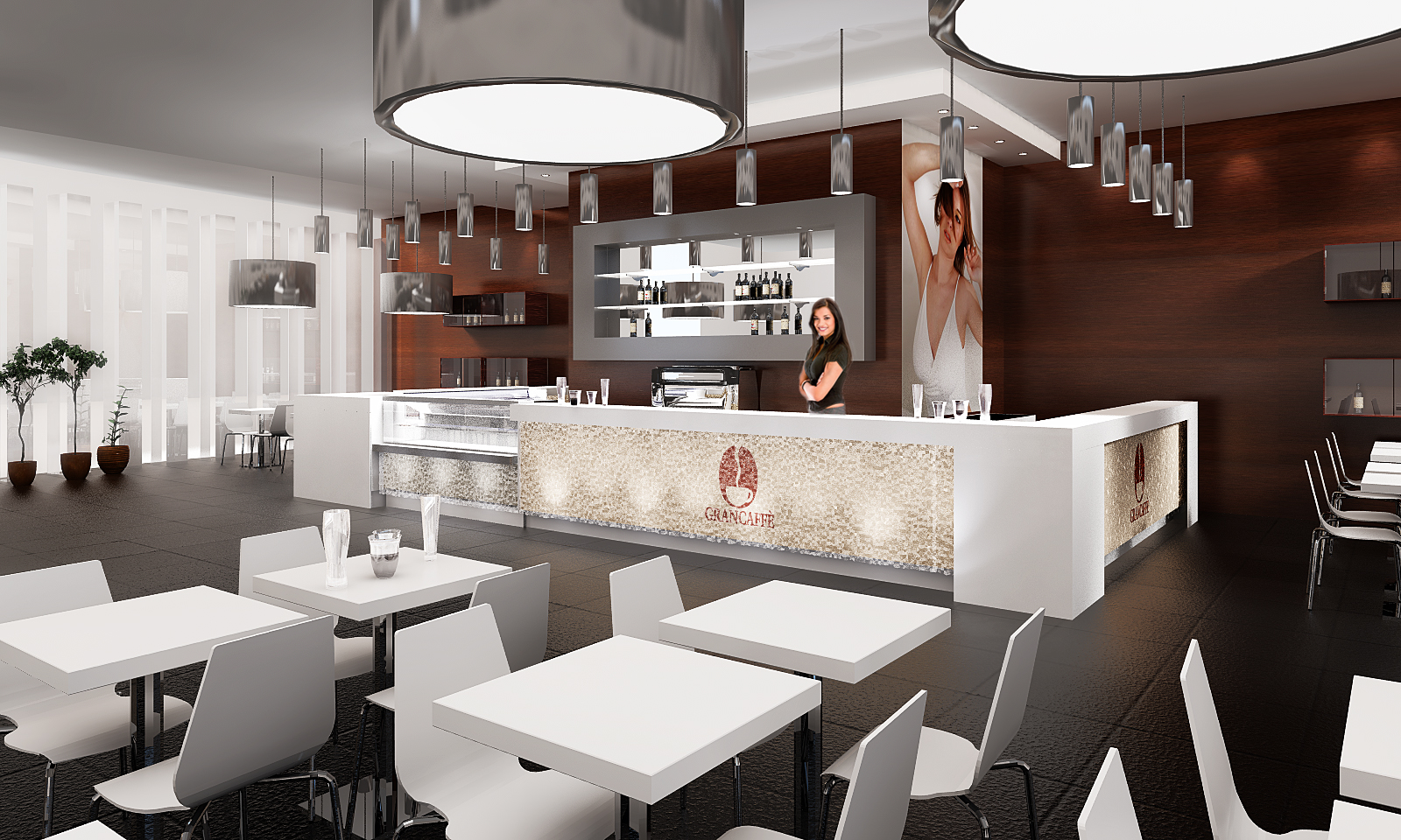 That's a nice set of furniture. I'm not sure what the big poster of the girl is doing there - is it backlit? Is it simply just a big poster on the wall?