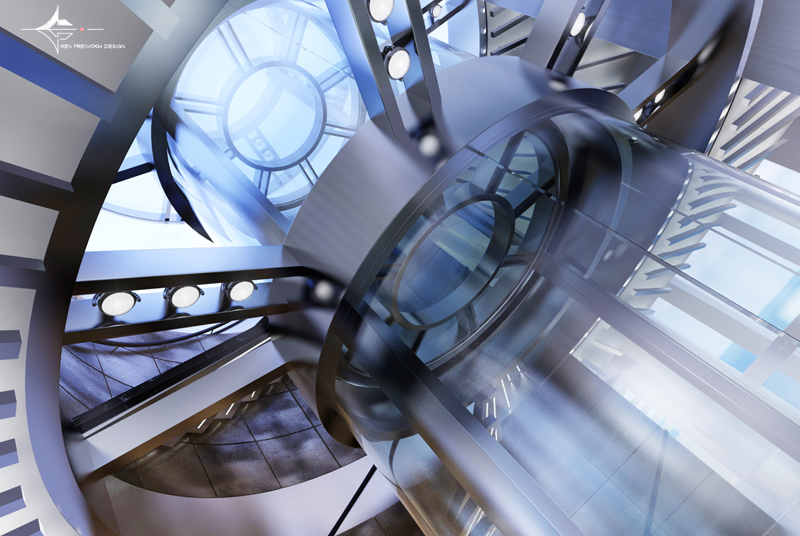 maybe i can see a cylindrical elevator with a circular staircase around it, or am i wrong? seems you tilted the camera nearly 45 degrees, if this is the sea horizon, outside...