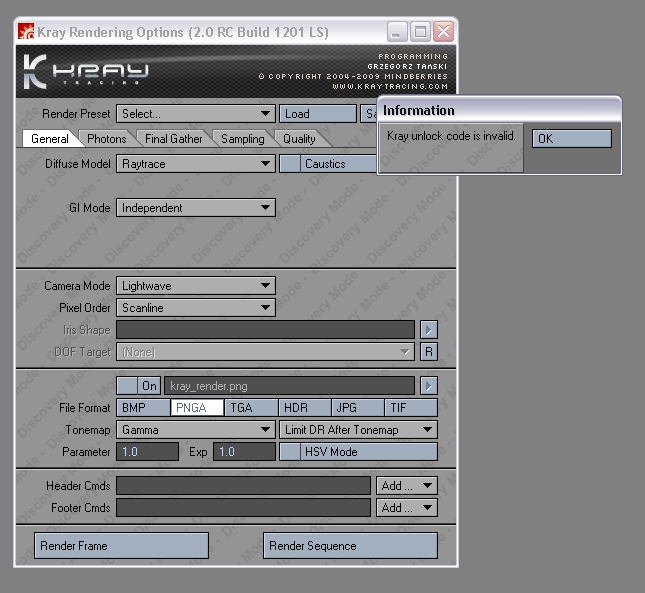 I have a separate dir for my models, and scenes, and I finally got kray 1.6 to work correctly when I placed the kray.p and kray.ls in that dir. I don't save my scenes in the lightwave dir. Here are samples of what I mean. testRender.jpg this is what I get when I hit the render frame button ...