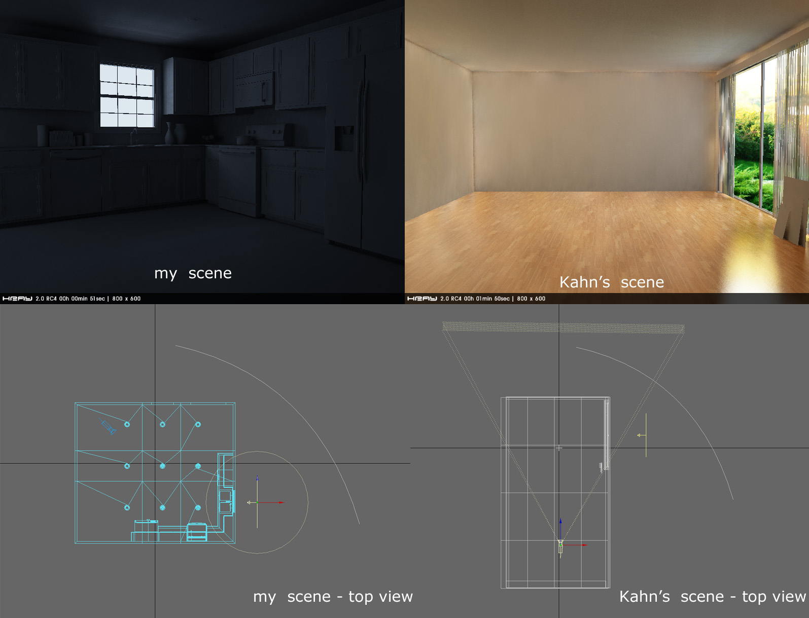 I've gotta be doing something wrong. I cannot consistently get nicely lit scenes (one of the reasons why I'm looking forward to RV's next Pro. Arch. Viz). I even pulled in a scene I was working on in to Kahn's test scene (http://www.kraytracing.com/forum/viewto ... f=6&t=1677), and just by swapping out the models, mine is still sooo much darker (see attached images). I understand in his scene, the window allowing light in is larger in his scene then the one in my scene. But the amount of light doesn't seem proportionate. Any help would be much appreciated.