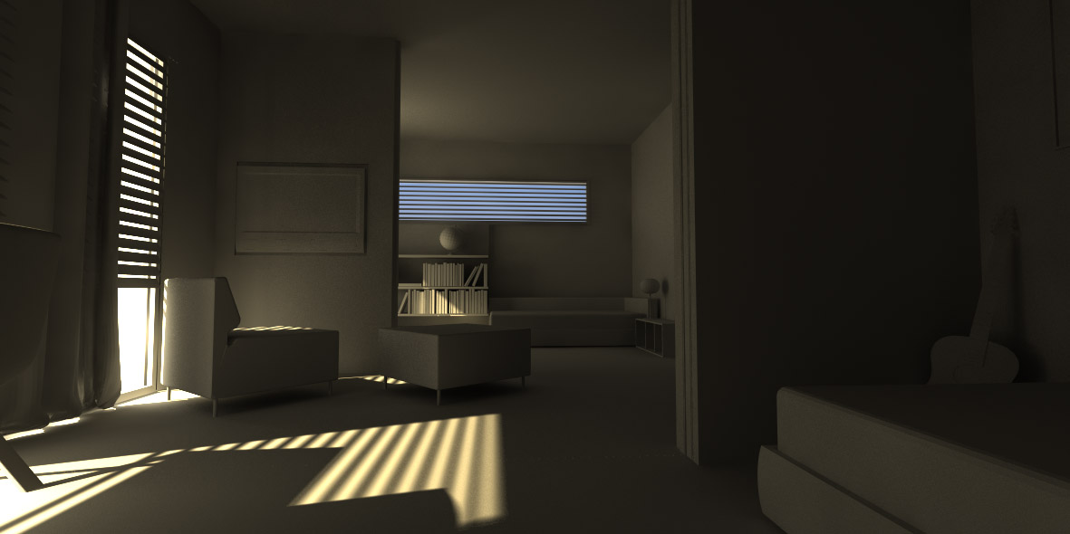 - very simple exterior: K-ray rendered it in about 1/3rd of the time of Lightwave (albeit with no significant differences in the output quality, but I'm willing to believe it's entirely my fault - I just selected "high" settings and let it go);