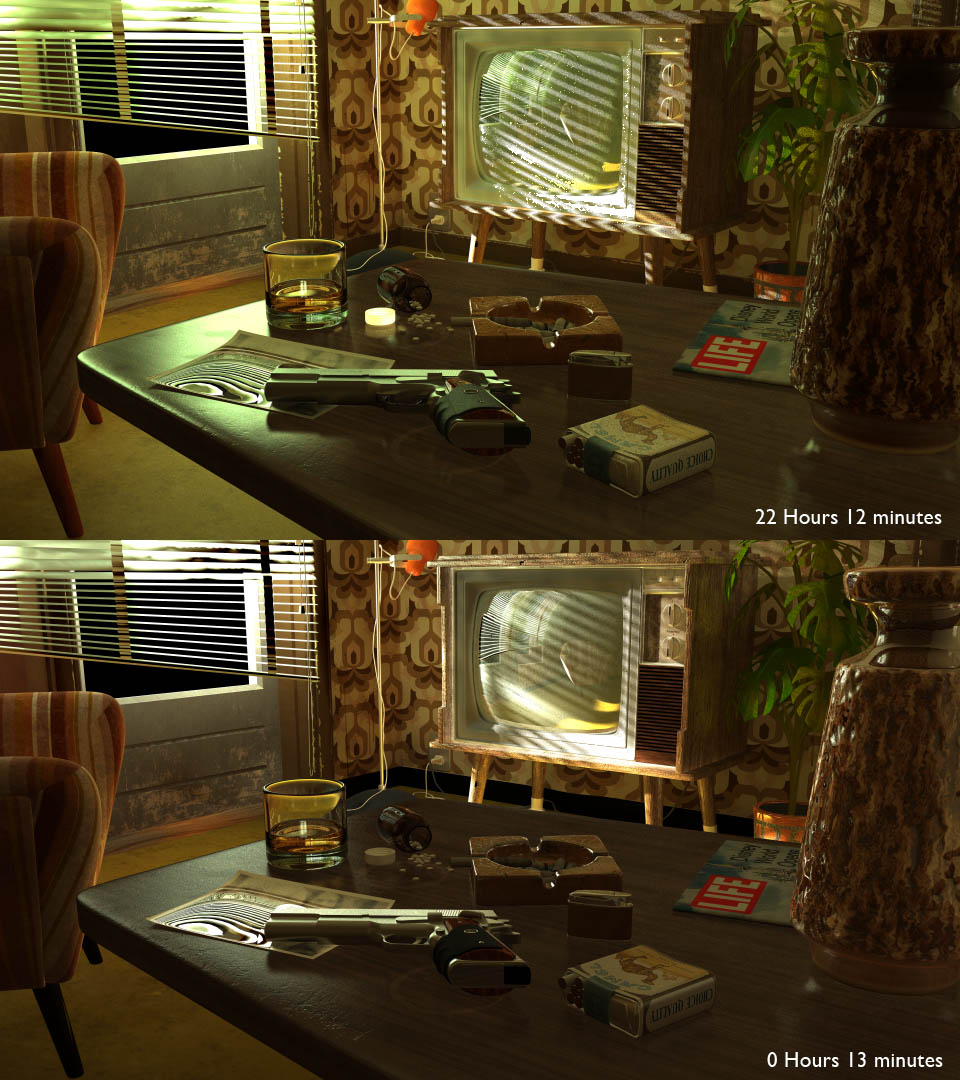 The difference in render time is 22 hours per frame. Most of that time, I'd say at least 20 hours, went to anti aliasing the top image.