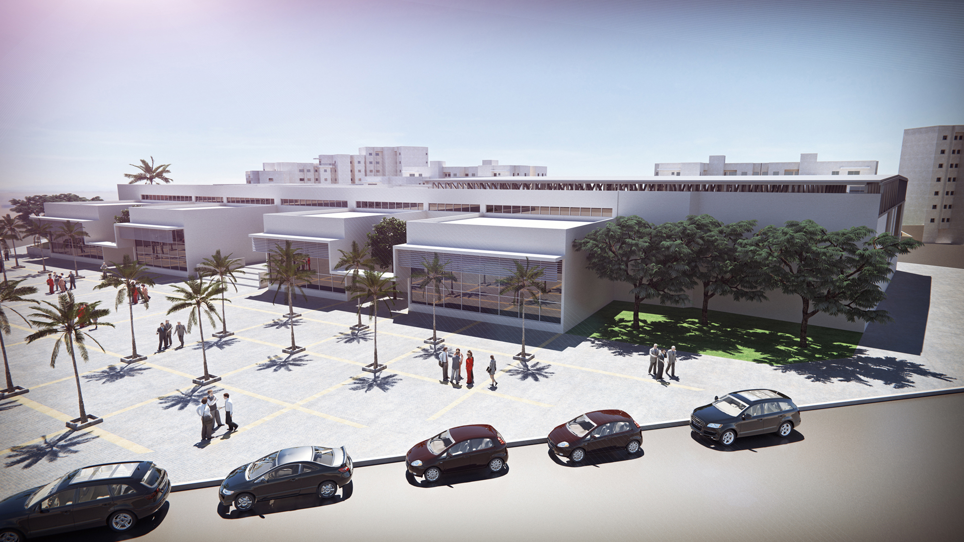 The three trees to the right... you're going to change those, right? When you do, make them a little smaller perhaps, they're way too big for the small space they're in and they make it look sad and abandoned. Also, the palm trees need a little ground to grow from - as it is now they seem to be planted straight into the pavement, which I suppose is not the case. And finally, the background building to the far right also seems to be "just there" - it needs some pavement, a sidewalk, the usual stuff, and it desperately needs some windows