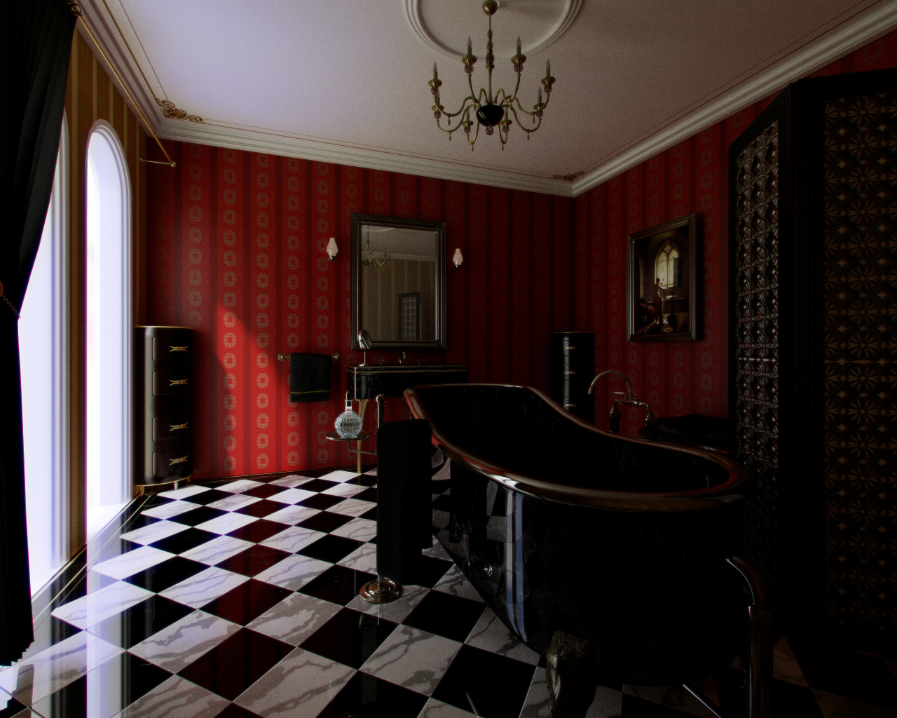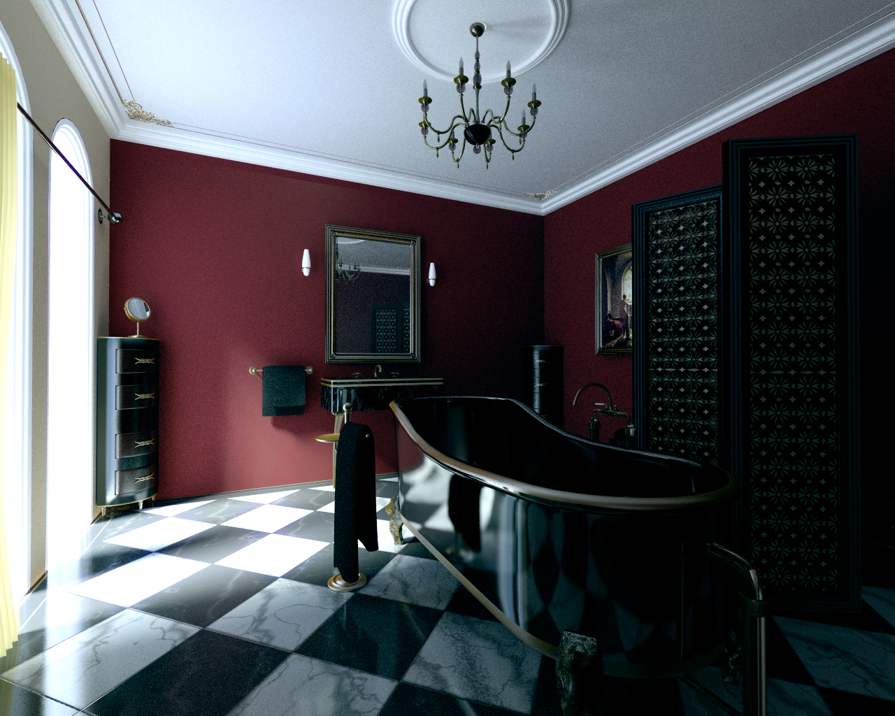 ). Towels are artificial (You must wait for displacement and velvet shaders...is no way to make it good now). Wall lams too small and a bit not composing to the style of rest the scene.