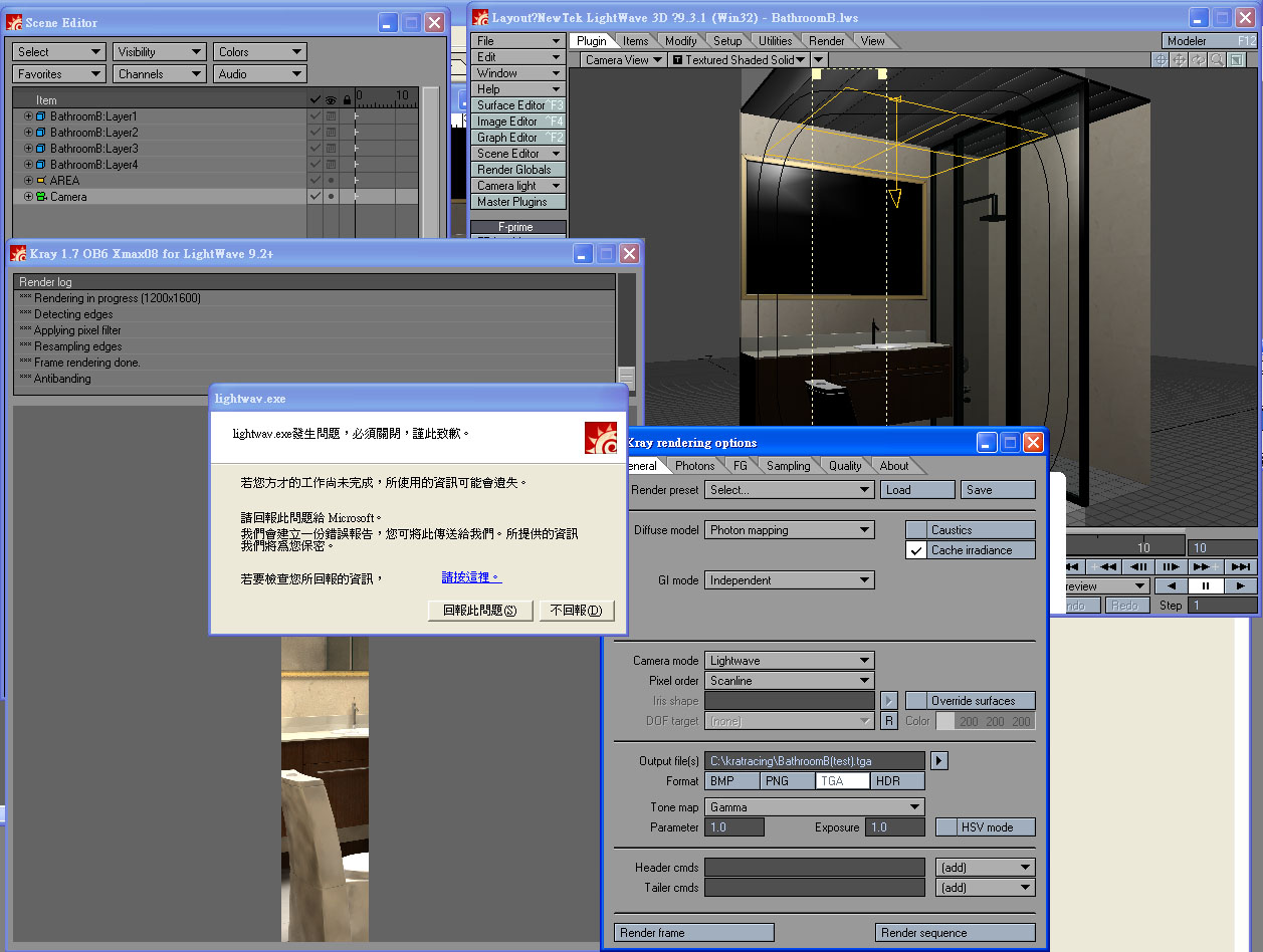 i try to render a bathroom scene, that is ok when i test render with 400x300 pixels while failed with a higher resolution rendering (1600x1200 or above).