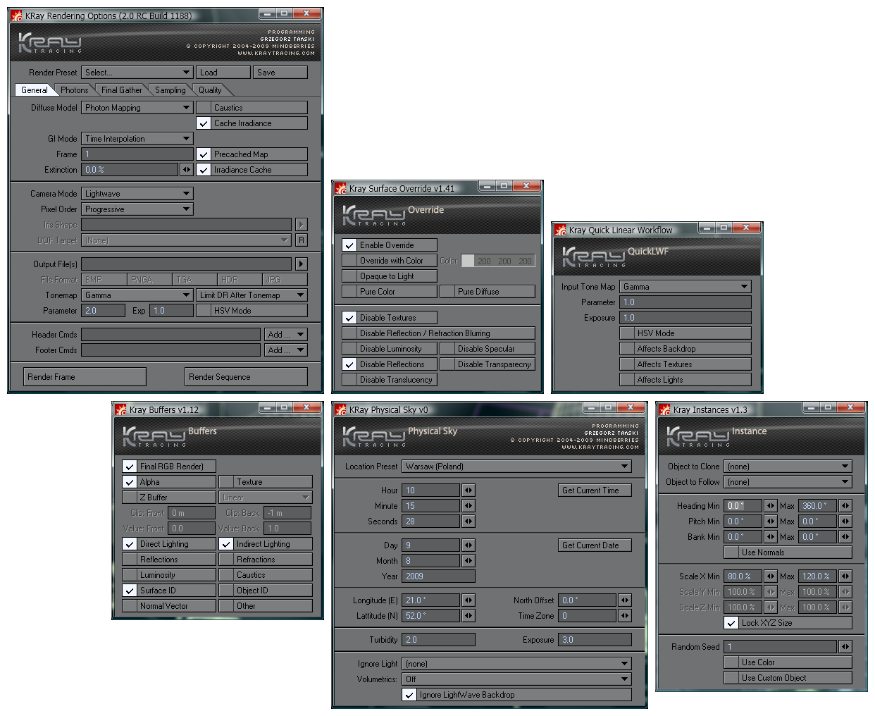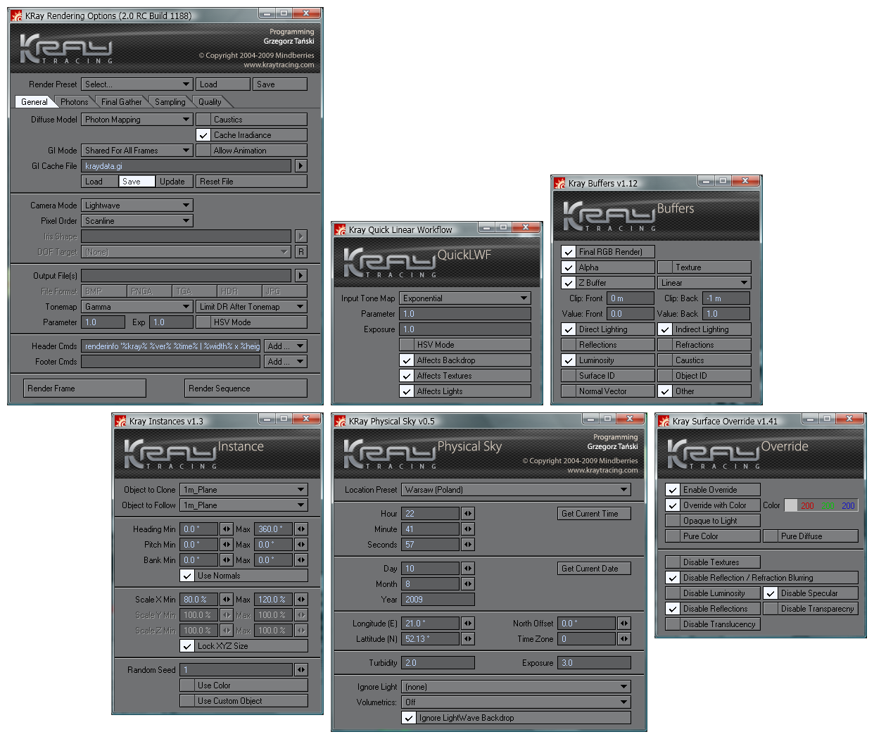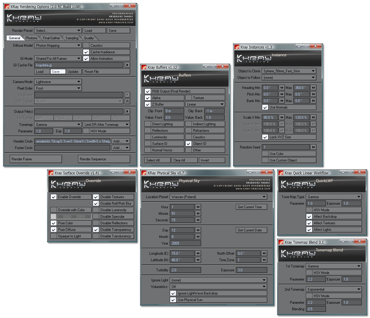 Updated Physical Sky script using Jure's latest version of the script. The geographical locations popup menu is still not hooked up, I need to understand the format for geo locations Kray uses, as the script denotes Longitude E / Latitude N, whereas the list of Countries I have formatted and ready have a mix of N E S and W locations.