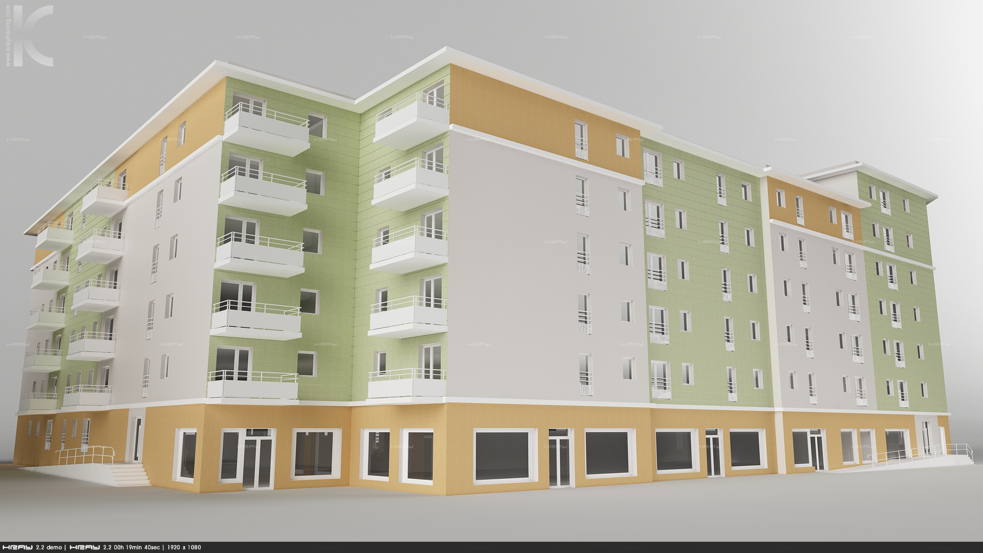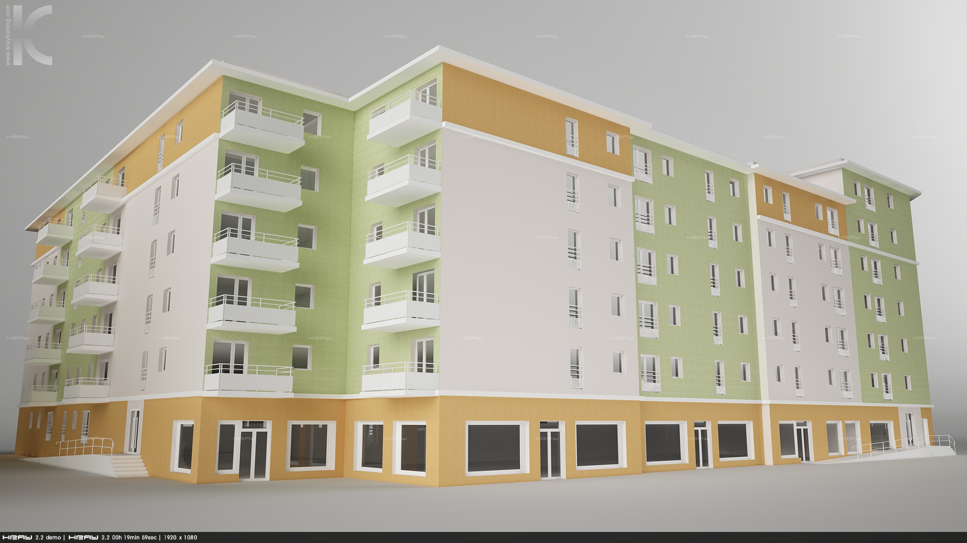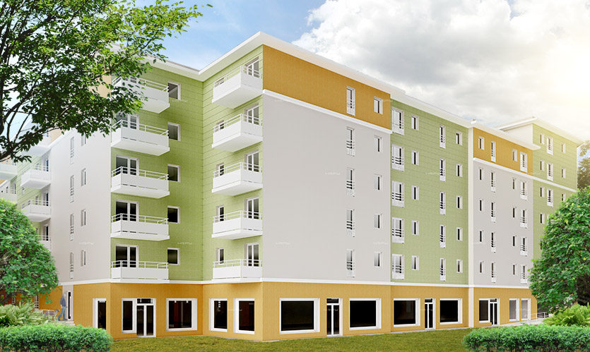 I try make fast PS for that. Contrast is very bad (You have bad tonemaping and setup of surfaces) Remember exteriors are difficult and render buildings without environment always bring bad contrast . Trees, trees and trees this You need to hold photons....