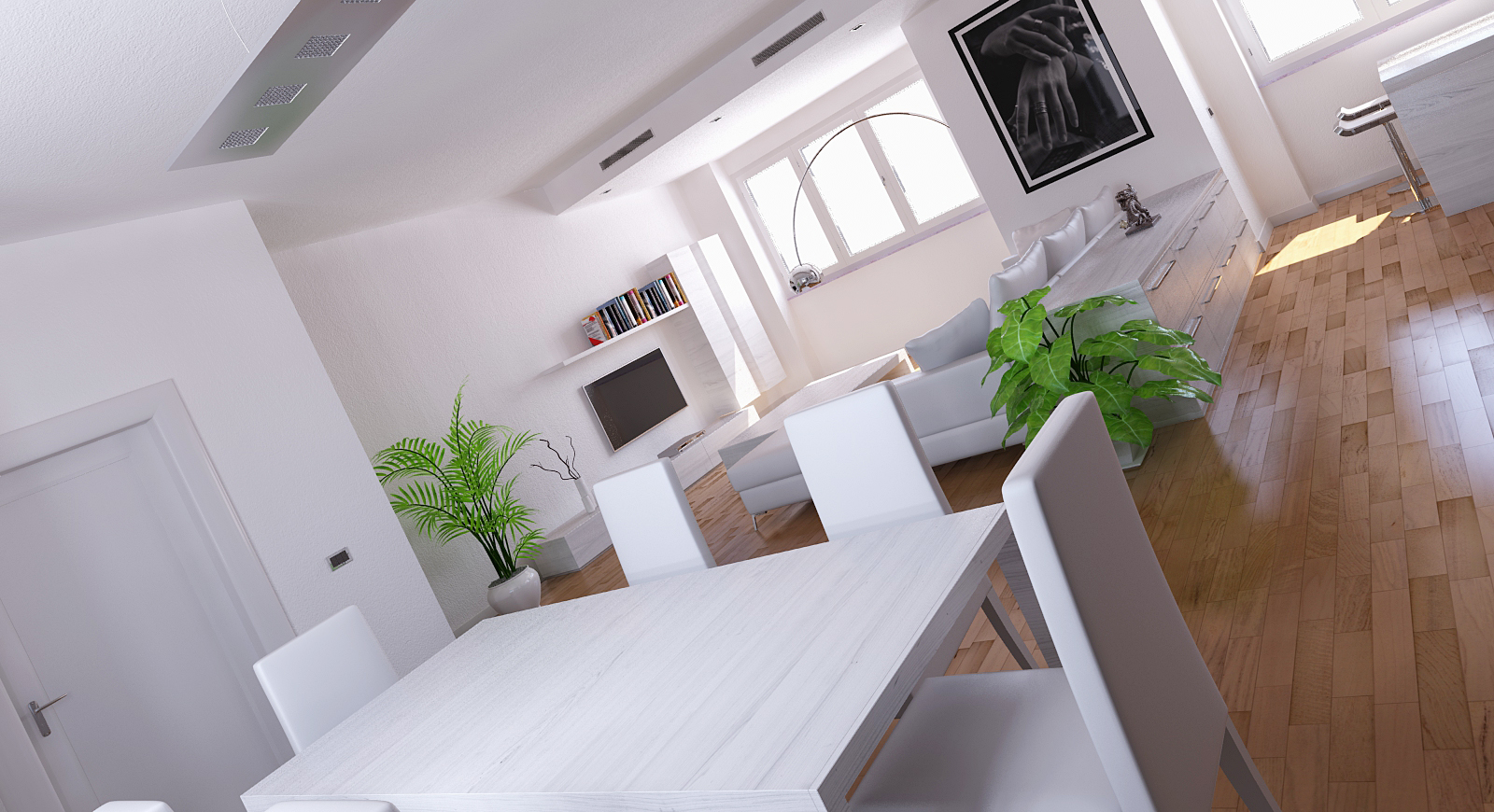 For the plants I agree. But still dont' know what kind of plants to use instead. For the floor, it's a specific request of the client. No more I can do about it. I've already worked on the reflection map to make more variation in reflection and so make the floor more intersting. For the sun effect: I like that kind of effect. It seems to me real.... what do you mean for a not full day Sun?