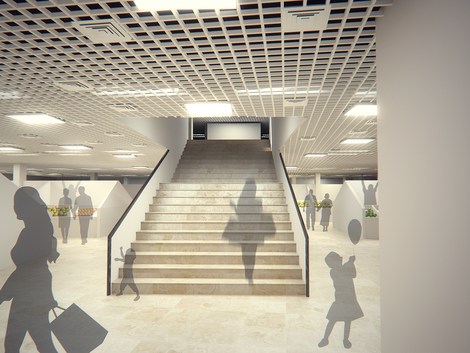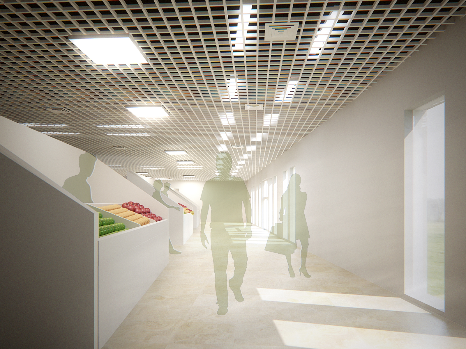 1) Introduce wood as a material and add some very quick rough detail by beveling some polygons to extend them. For example, the furniture holding the fruit or the table: make either the walls or the table wood (leaves some parts white as they are). Extend either the vertical front parts of the walls or the fronts of the tables by beveling, so they stick out a little bit (5 to 10cm).