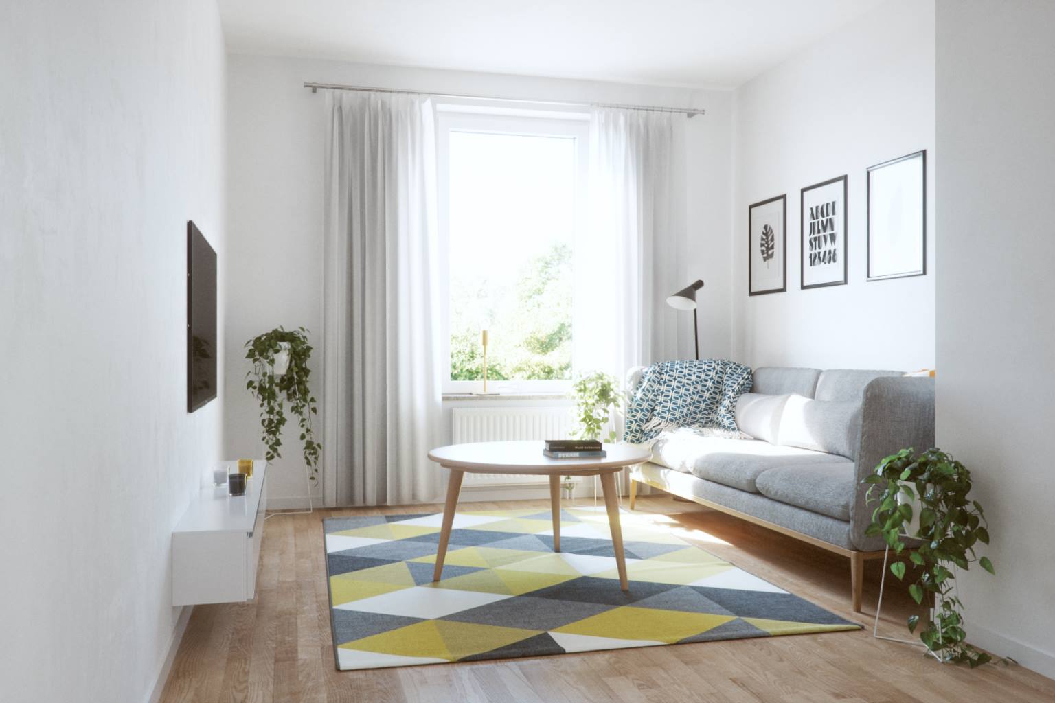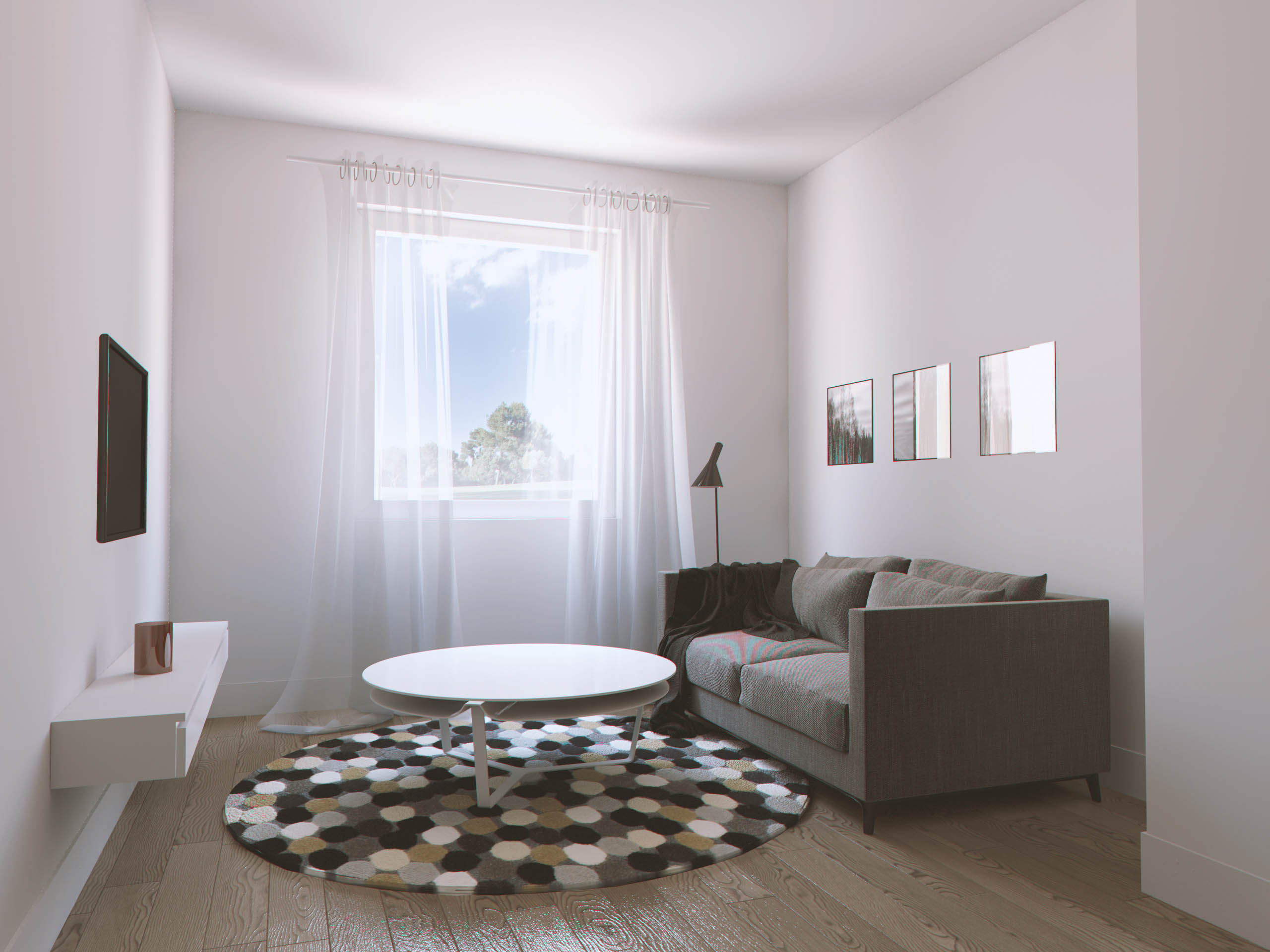A couple of things stick out to me. First the carpet seems to be floating - no contact point - maybe an area that ambient occlusion could help. Also on the first image the bump on the floor is too great. Otherwise it's pretty good.