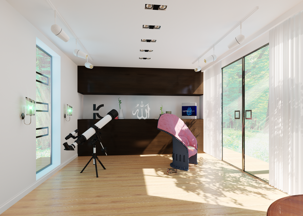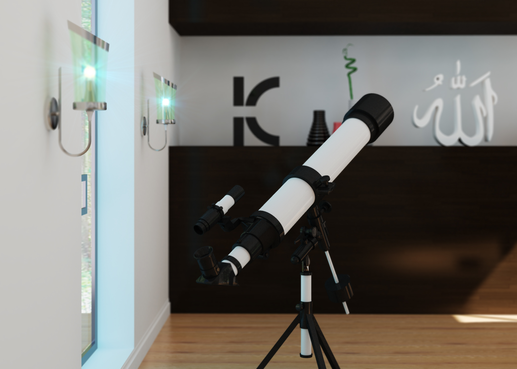 here a few tips to refine your work: first, please, turn the lights off, the sunlight is bright enough or is a sudden eclipse expected? maybe this is the reason for the astronomical observation monocular? btw. this is the most abused archviz interior accessory of any time... ;)
