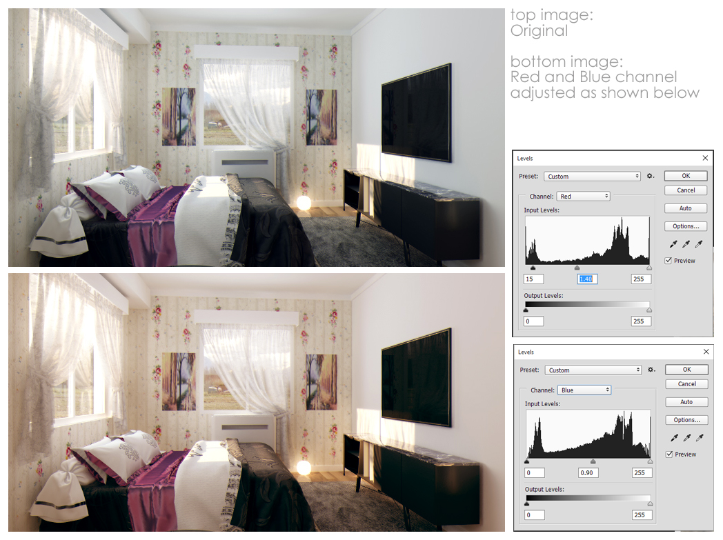 Now, when you do this separately for R, G and B you can adjust the contrast and color grading in a way that makes your highlights neutral, your midtones more warm and your shadows more blue or green, which is a bit how interior lighting works.