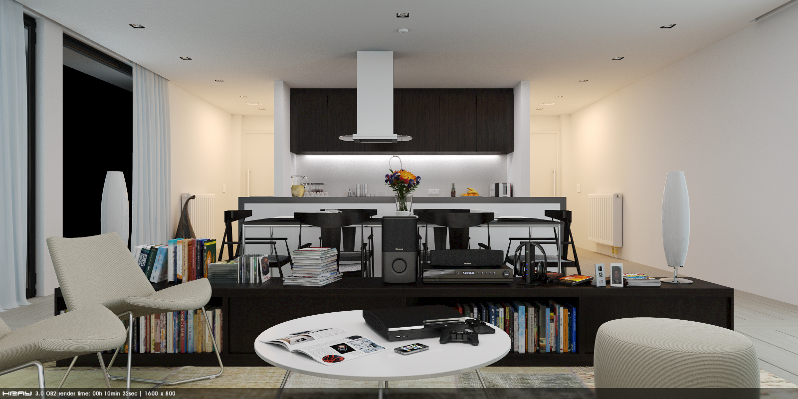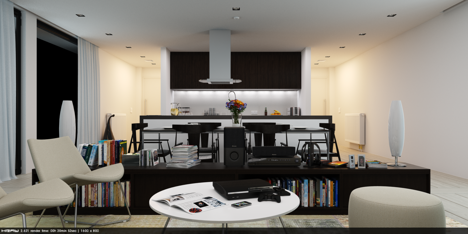 - K2 the highest quality with Area Lights and QMC which allow me render scene in reasonable time. Visible still bad Area Light quality in kitchen area.
