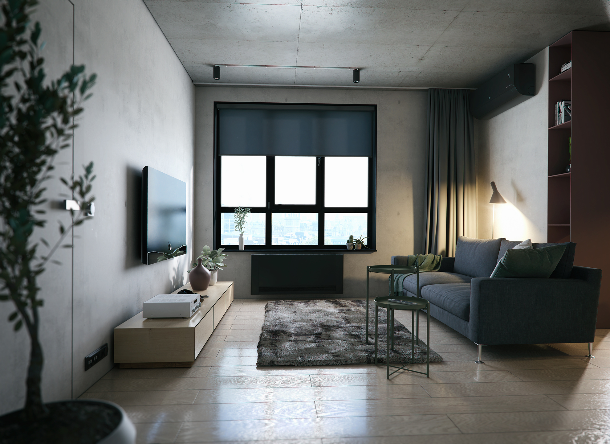 3) Same for the wall mounted air-conditioning: an appartment with this style and detailing would have vents integrated in the ceiling or wall. Given the narrow open join of walls and ceiling you could just delete the airconditioning. Of course I don't know what I'm talking about, because maybe your client is an airconditioning manufacturer that needs these images, or a project developer that wants it in there.