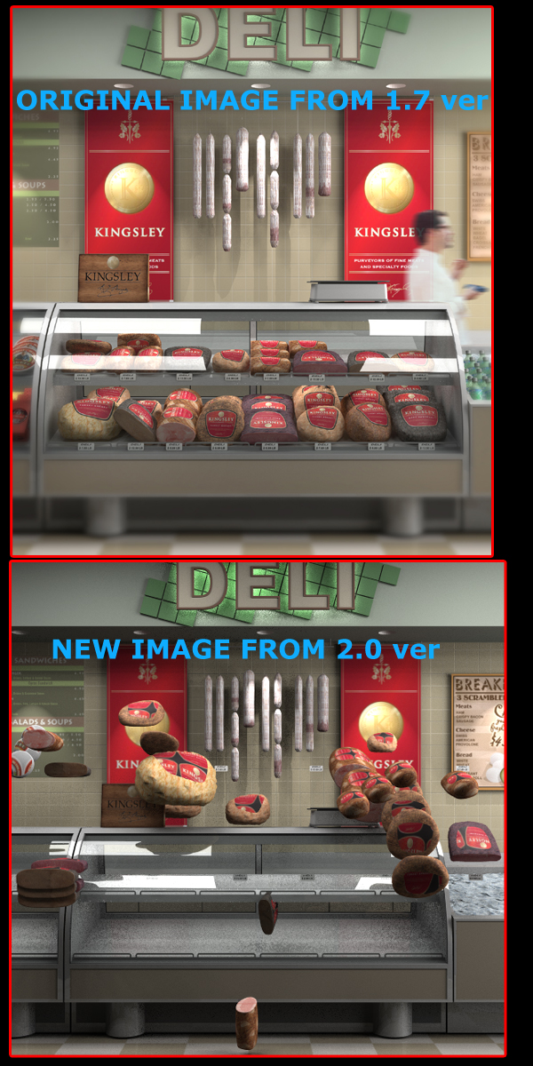 I recently did a small project of a deli merchandising in kray1.7. When i re-render the project in the new version 2.0 all the deli meats are floating around the scene. It looks a bit funny. but for the life of me i cant figure out whats happening. I see 3 distinct problems: