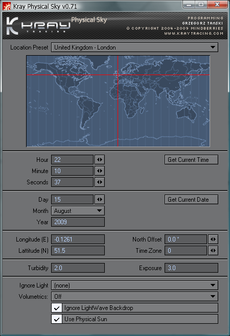 Updated Physical Sky script using Jure's latest version of the script. The geographical locations popup menu is still not hooked up, I need to understand the format for geo locations Kray uses, as the script denotes Longitude E / Latitude N, whereas the list of Countries I have formatted and ready have a mix of N E S and W locations.