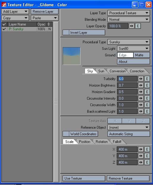 Skylight texture is blue ( Horizon brightness: 0.5 ; turbidity: 6.0 ; Value: 1.65)