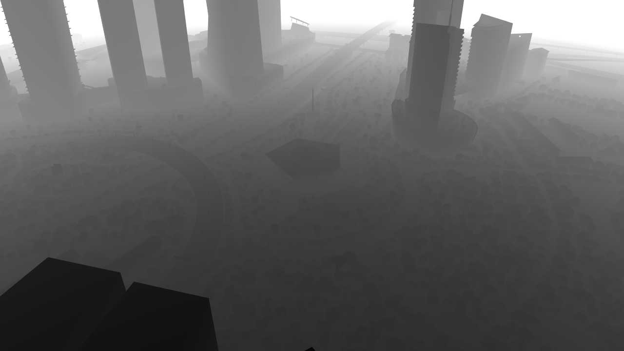 I think for this camera (last render ) front and back clip should be different: around 500m/2000m....you don`t need effects fog near camera