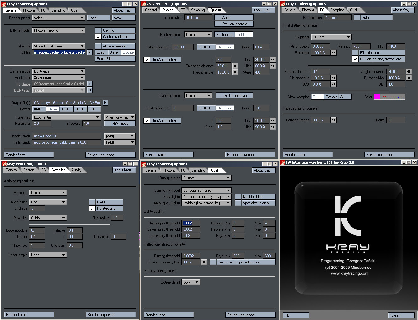 Man...still getting 30min render times per frame on a 720x350 resolution. What's strange is that it doesn't change much on the render time caching the GI. It goes from 29/30minutes to 25 minutes. I mean 5 minutes less per frame is 5 minutes less per frame, but come on...this is Kray! with a quad-core processor and on a 720x350 resolution.
