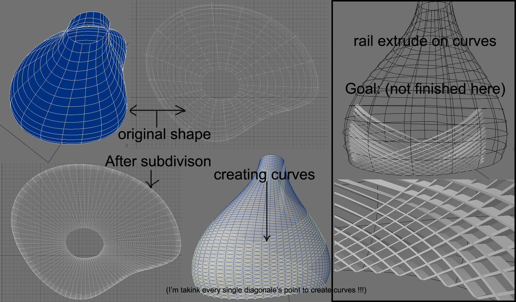 Then I decided to subdivide the surface in order to get many points to finally be able to create these diagonal curves...