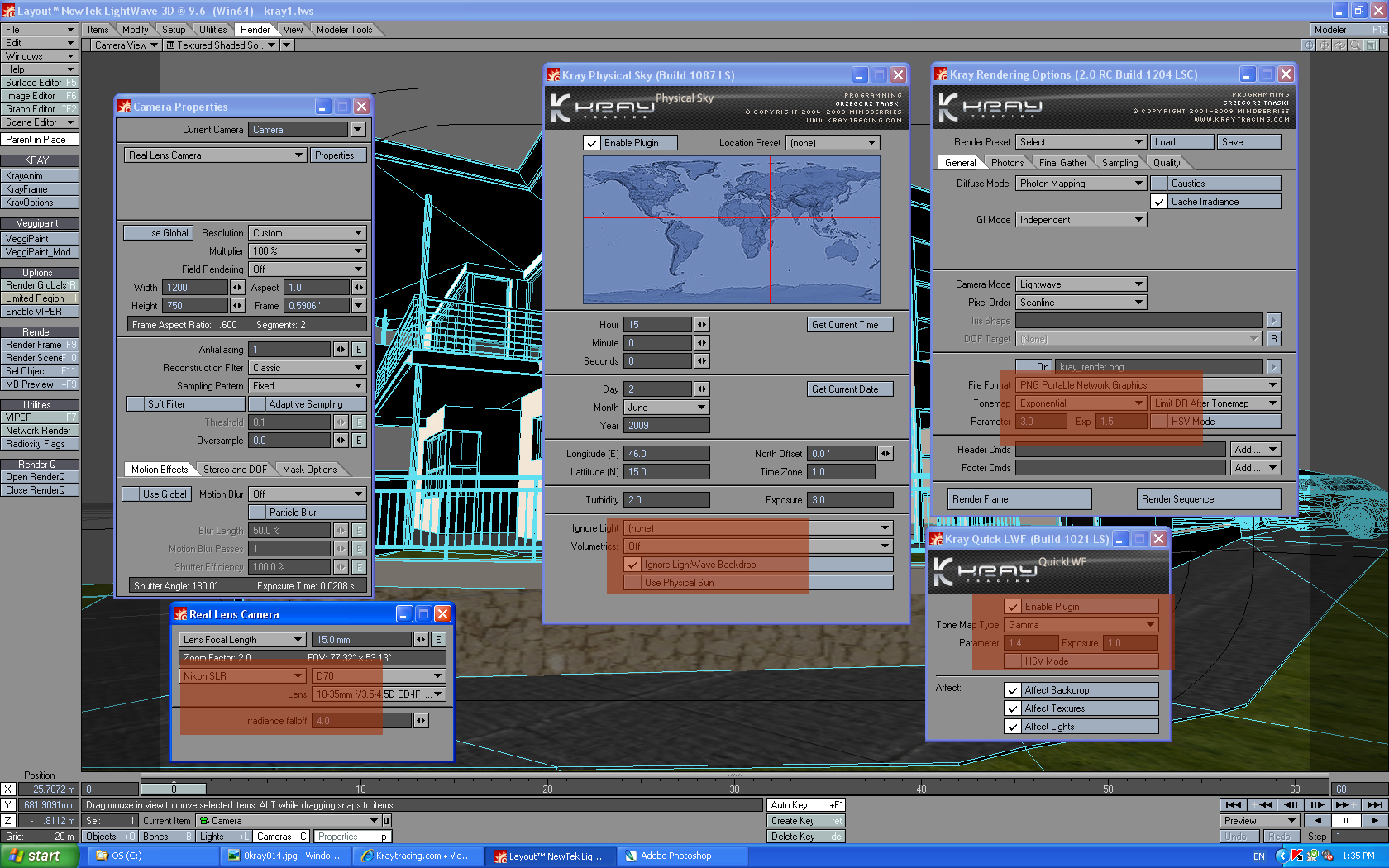 this was an old model, no nodes used. i think LW has no node surfacing when i did this model. i jsut load it and didnt change anything but just render with kray and see what it going to look like. trees n sky are PS. attached here is the setting i used in kray, i marked with red box to show only the changes i did. phy sky with sun off. "medium" preset setting. i use area light as my sun, with inverse sq.m, 1 km away. no tonemapping just kray QLWF. this settings may not work with others but doing a lot testing QLWF or tonemapping until i get that balance that makes me