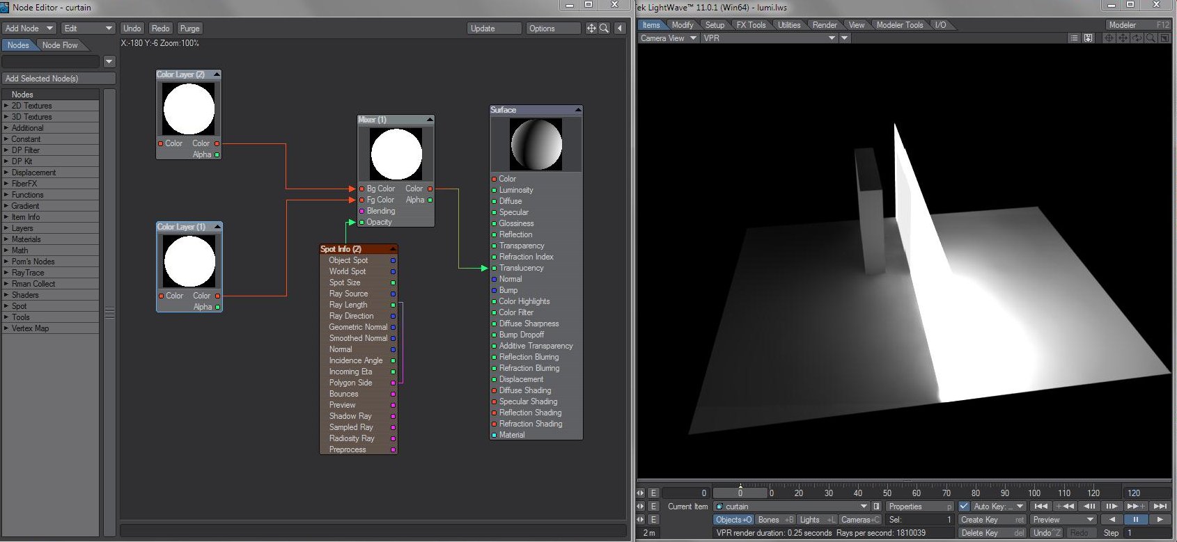 I thought setting Diffuse+Transparent + Translucent on a double sided surface could mimic the real curtain in Kray at first.