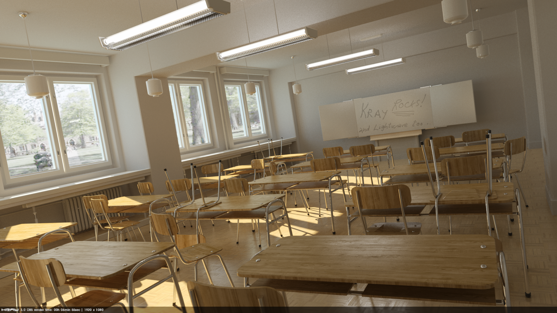 Very good test scene for checking speed render an quality. Big amount of LimitDR problem (places where exist high contrast pixels). In this case chair metal parts. This is common problem for all renders: how to deal with Anti Aliasing in these regions.